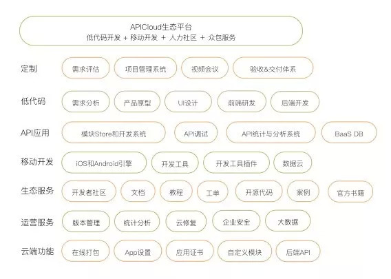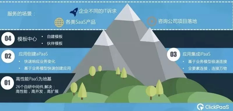 另一类是基于模型驱动的模式,以PaaS技术为重点,可以通过调用各类功能模块开发出不同类型和规模的应用,比如APP、ERP、CRM等。其能应对企业不同程度的复杂场景开发需求,既能服务大企业客户,也能服务中小企业客户,APICloud和ClickPaaS都是这一类的平台。