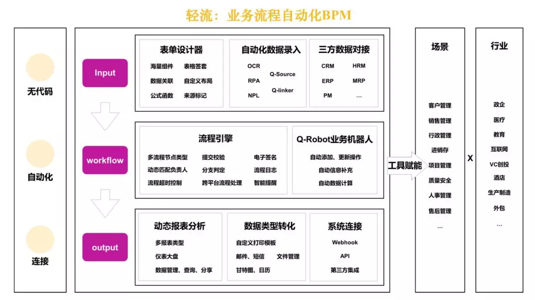 一类是基于表单驱动的模式,以BPM技术为重点,可以通过多个有层级关系的表单串联出一个轻量级应用,比如一个进销存管理工具。其主打零代码开发,可以视为是传统单一表单制作工具的升级版,轻流便是这一类企业。
