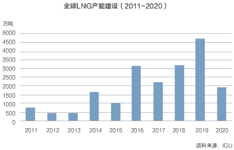 回顾近十年来全球LNG产能建设,2011-2015年间全球每年通过最终投资决策(FID)的项目均达到2000万吨以上。受2015年以来国际油价暴跌影响,2016-2017年全球LNG行业投资趋冷,两年间全球通过FID的产能仅为630万吨和340万吨,2017年全球仅有一个项目通过FID。但进入2019年以来,全球LNG项目产能建设一扫前两年的低迷状态,呈现出“爆发式”增长态势。
