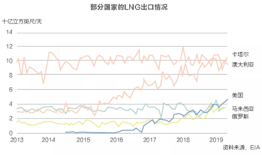 这其中,澳大利亚即将成为世界第一大LNG出口国。2011-2019年间,澳大利亚的出口能力从26亿立方英尺/ 天迅速增长至114亿立方英尺/天(约8500万吨/年)。根据澳大利亚DIIS(Depar tment of Industry,Innovation , and Science)预测,随着Ichthys LNG T2和Prelude浮式LNG等更多新项目投产并满负荷运行,澳大利亚LNG出口量将持续超过卡塔尔(2018年11月和2019年4月,澳大利亚在液化能力和出口量上已超过卡塔尔)。