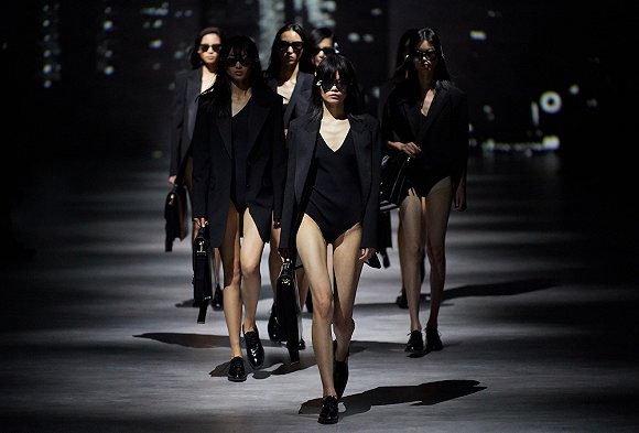 三个多小时后,这场主题为“中国新女性”的大秀如约而至。整场大秀以七位模特的群像表演开场:她们戴着墨镜,身着黑色西装,手提大号黑色邮差包,脚踩黑色尖头漆皮鞋,踩着节奏强烈的电子乐成群结对出场。