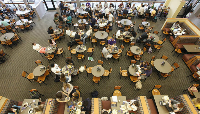 苹果公司吃饭不免单,但价格却贼低,据说4美元能买一大盆。然而苹果公司的餐厅却狭小又寒酸,吃饭变得跟打仗一样,你周围站满了同样抢座位的饿货。