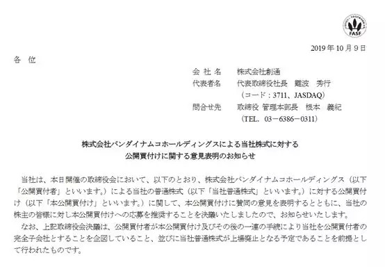 近日,万代南梦宫集团(以下简称“万代”)发表了公开收购创通的计划。万代本身持有创通的22.79%的股份,如今的目标是取得剩下的所有股份,也就是将其并为完全子公司。