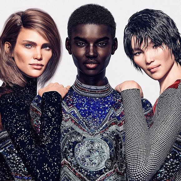 例如Balmain的2019早秋系列广告中,Rousteing用三个电脑合成的虚拟人来做模特,分別为法国的Margot、中国的Zhi和非洲的Shudu Gram。Shudu Gram为英国摄像师Cameron-James Wilson创造的全球首位数码超模,后来在蕾哈娜的美妆品牌Fenty Beauty广告中一炮而红。