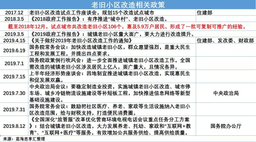 步入2019年,政策集中发力,大力推进老旧小区改造。7月1日,国务院新闻办公室举行国务院政策例行吹风会上住建部表示:老旧小区改造上升至国家层面,既是一项民生工程,也是一个非常有效的稳投资举措。