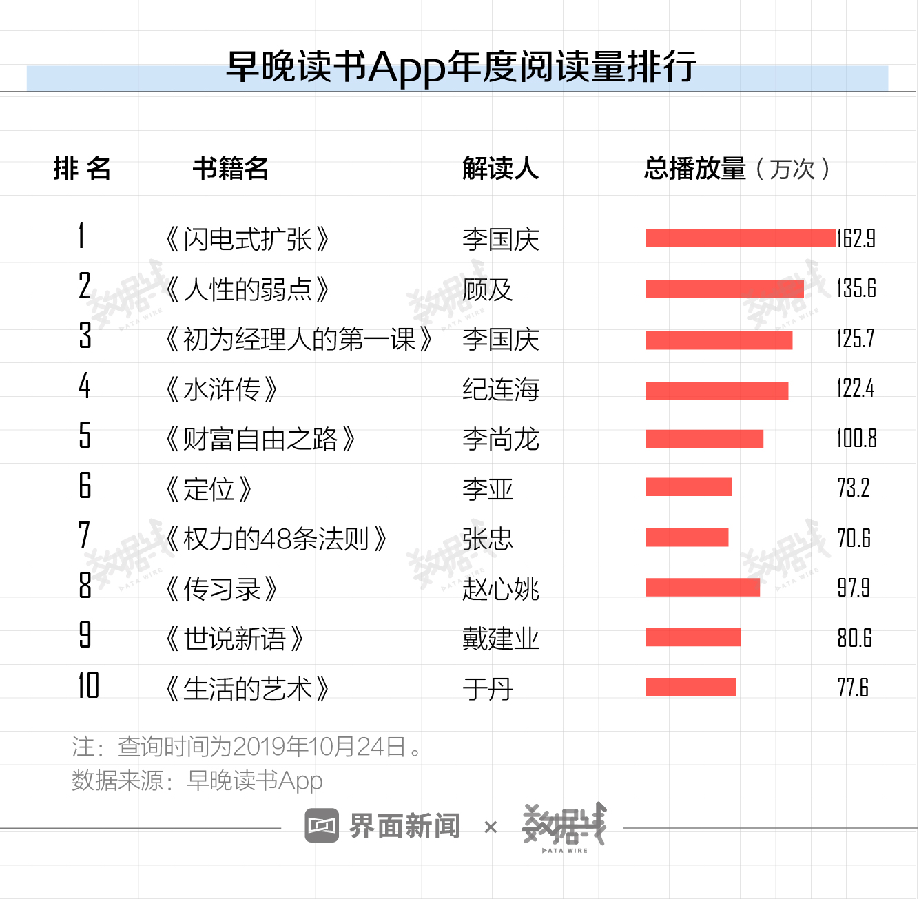 上线不足半年的早晚读书还处于初创期。界面数据(公众号ID:shujuxian_kuaikan)统计了App的阅读总榜,已有包括李国庆亲自讲解的《闪电式扩张》在内的五本书播放量突破百万。