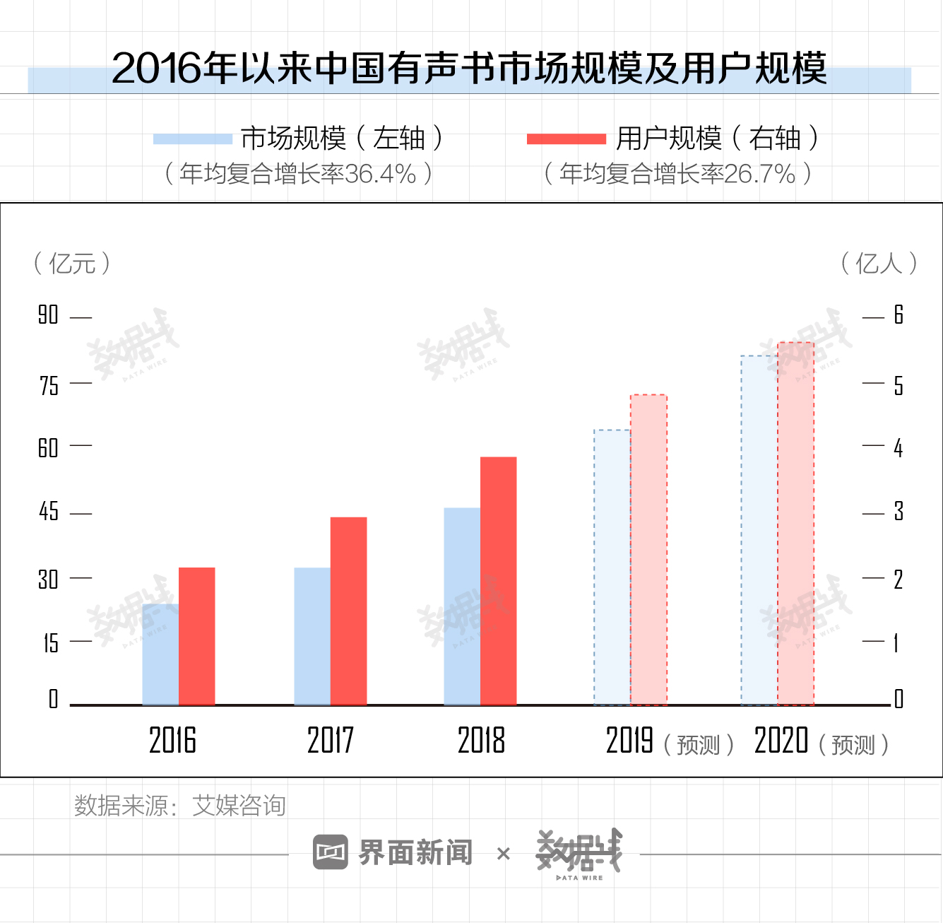 有声书方面,艾媒咨询的数据也显示,该领域的市场规模和用户规模都保持着高速增长,预计2019年的市场规模将达到63.6亿元,用户规模将达到4.78亿人。