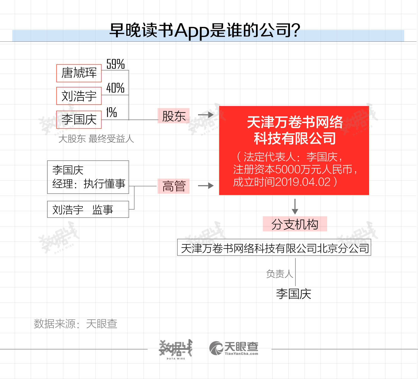 天眼查数据显示,早晚读书App的主体公司天津万卷书网络科技有限公司大股东为当当影业CEO唐虓珲,占股59%;第二大股东为刘浩宇,占股40%。在公司担任经理、执行董事、同时也是公司法定代表人的李国庆仅占股1%。
