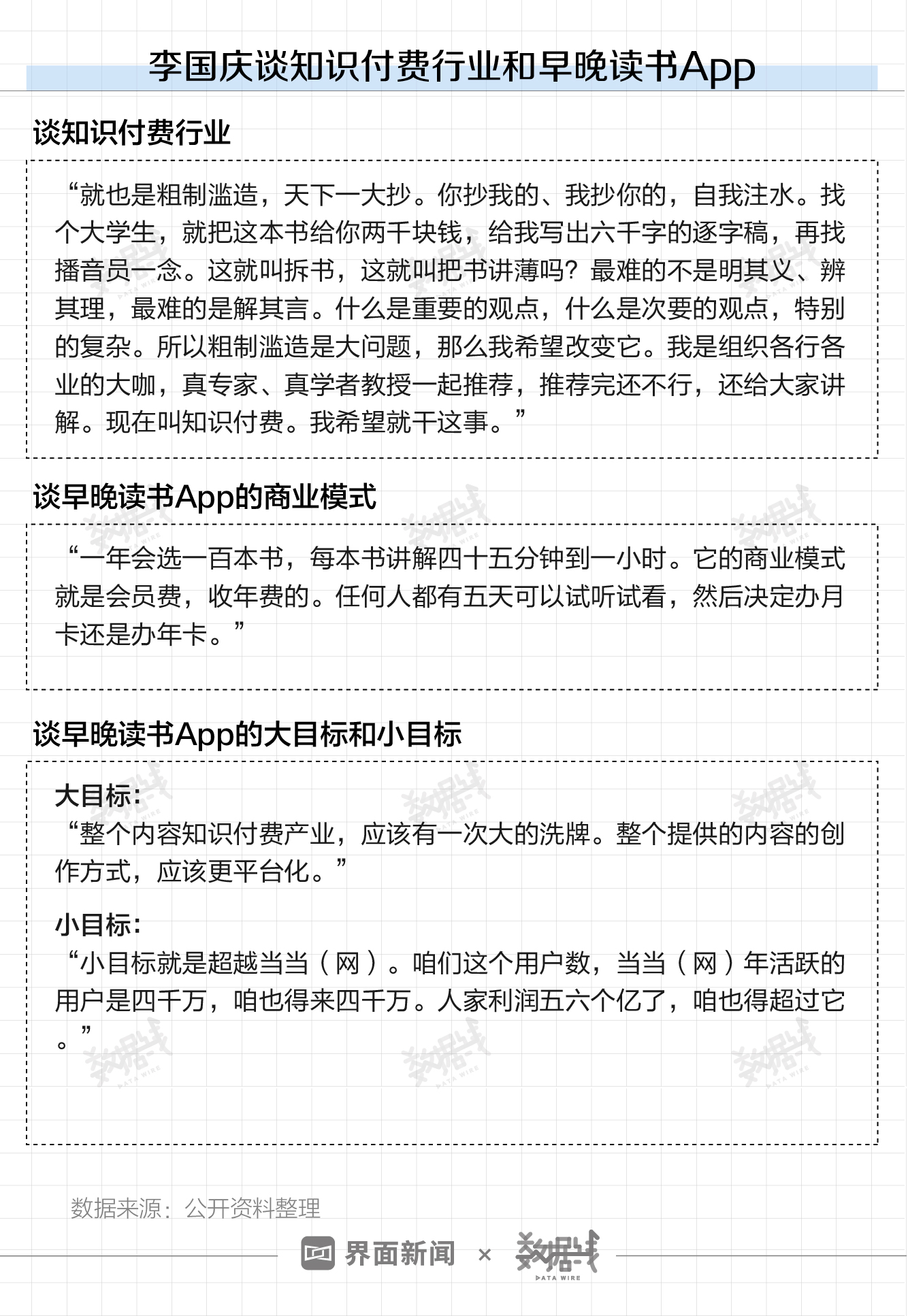 今年6月1日,李国庆离开当当后的创业项目“早晚读书”正式上线。在接受采访谈及早晚读书时,李国庆寄予其很高的期望,称小目标是在用户数和利润上超越当当。