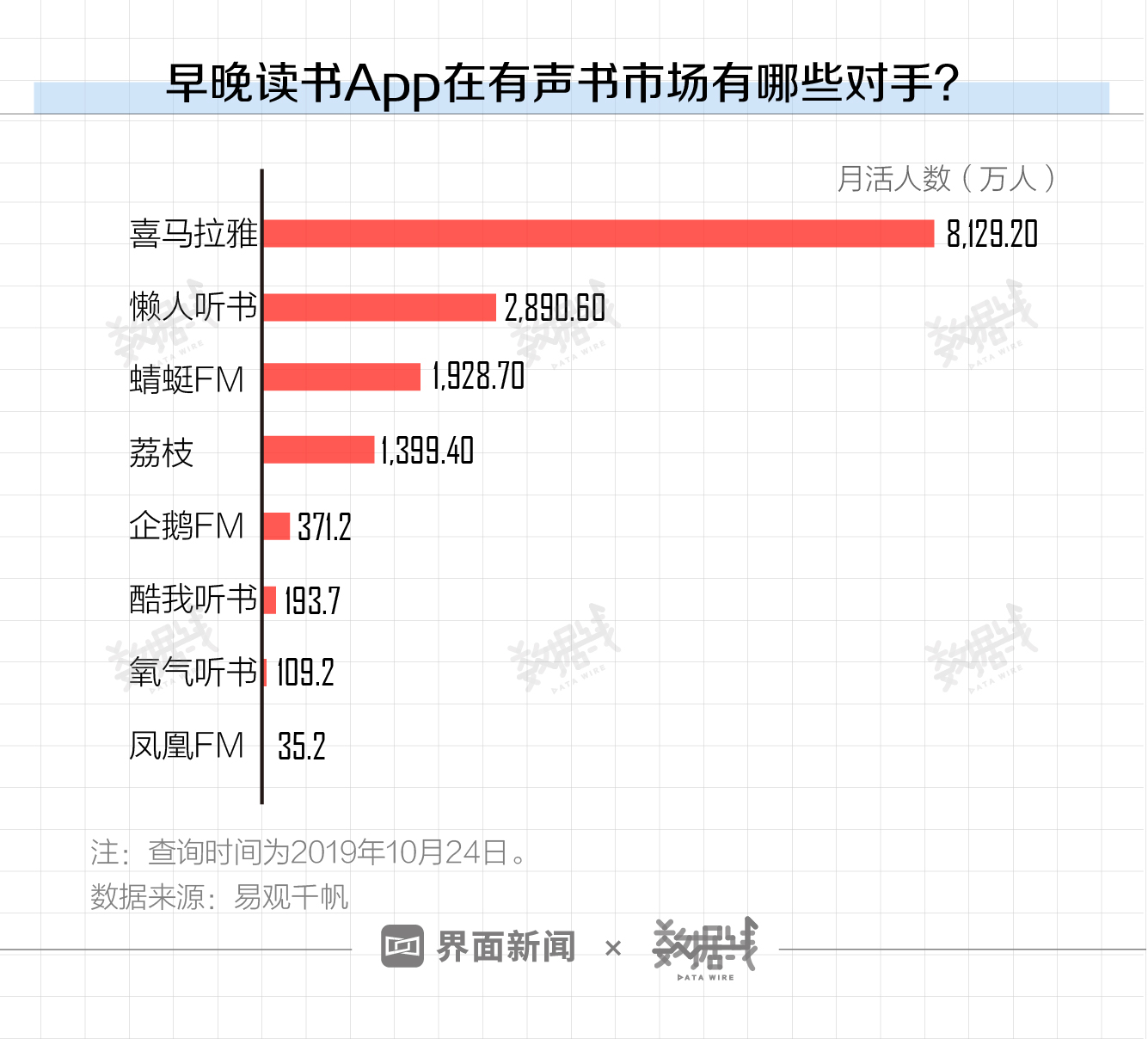 虽然已有多个内容播放量突破百万,但在有声书市场,入局不久的早晚读书App需要面对多个强劲对手。易观千帆数据显示,有声书市场的头部品牌喜马拉雅、懒人听书、蜻蜓FM和荔枝月活用户数均已突破千万。排名第一的喜马拉雅月活用户数更是高达8129万。据天眼查数据,2018年完成4.6亿美元E轮融资后,喜马拉雅的估值已高达36亿美元。