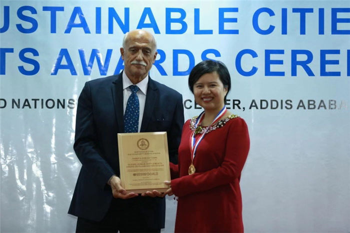 (联合国环境署专家阿拉布·霍巴拉向江宇集团营销公司总监穆蓉倩女士颁发“全球人居环境规划设计奖”)