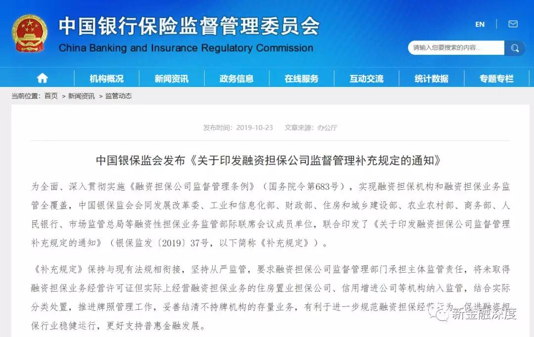 10月23日,银保监会官网发布《关于印发融资担保公司监督管理补充规定的通知》(银保监发〔2019〕37号,以下简称《通知》)。