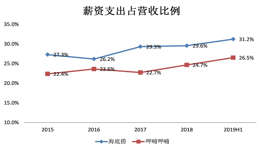 以极致服务为特色的海底捞,人工成本远高于行业平均水平。截至2018年末,海底捞共拥有员工6.9万人,员工平均薪资约为7.3万元,较2017年有所提升,高于业内平均水平。海底捞薪资支出所占营收的比例也是逐年升高,从2015年的27.3%上升到如今的31.2%。并且比同行呷哺呷哺高5个百分点左右。这对于原本就薄利的餐饮行业影响很大。