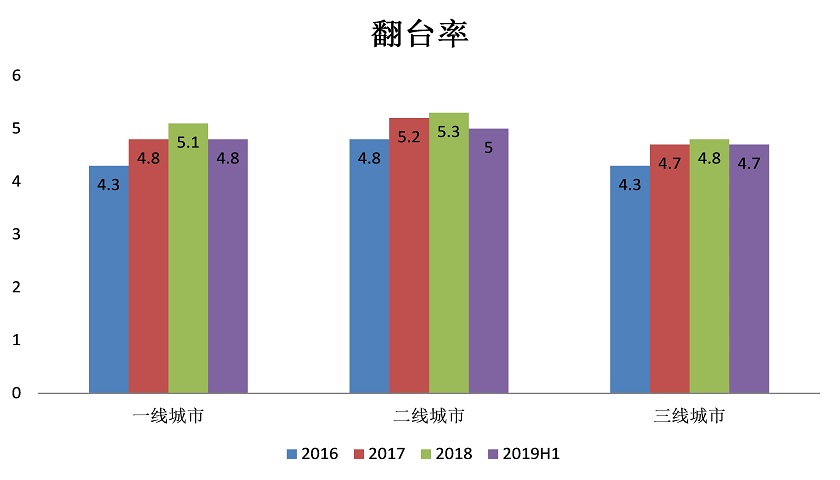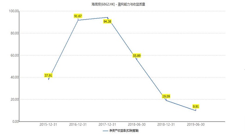 根据2019年半年报,海底捞中国内地餐厅翻台率为4.8次,而去年同期为5.0次。而且,一至三线城市的翻台率全部出现下降。不仅如此,新开餐厅的翻台率降幅更大。从2017年的4.6次大幅下降至目前的3.9次,表明新开餐厅的盈利能力已经不比从前。