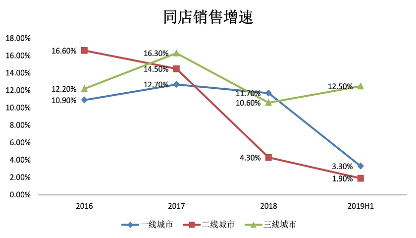 虽然三线城市同店营收的表现仍维持在较高水平。但是,三线城市营业收入只占海底捞的20%不到,对整体营收贡献有限。2018年和2019年上半年,海底捞同店营收增速分别为10.6%和12.5%。根据半年报,三线城市门店顾客的平均消费增长3.2%。同店就餐人数则增长了9%。说明海底捞三线城市单店收入仍有增长空间。而且,海底捞表示未来门店下沉将是下一步的重点工作。