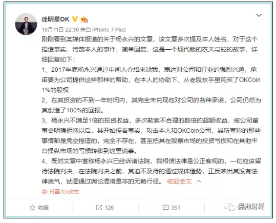 对于杨永兴所言的种种细节,OKCoin创始人徐明星在微博上回复称,这是一个现代版的农夫与蛇的故事,而且杨永兴本人也是OKCoin小股东,“杨永兴不满足1倍的投资收益,多次勒索不合理的数倍的超额收益,被公司董事会明确拒绝以后,其开始捏着事实,攻击本人和OKCoin公司。”