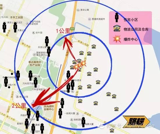 天津港这次爆炸事故发生在跃进路与吉运二道交叉口,周围不仅仅有进口汽车的停车场,还有不少居民小区。据媒体报道,爆炸强大的冲击波横扫半径三公里以内的区域,遗憾的是,我没有看到关于居民住宅损失的详细报道。我在百度地图上查了下,距离爆炸中心三公里至少有13个居民小区,它们分别是:天滨公寓、万科海港城、启航嘉园、万科金域蓝湾、万科双子座、合生君景湾、万通新城国际、弘景苑、瑞达公寓、伴景湾家园、瑞嘉公寓、天津天保房地产公司开发的各种轩(包括月韵轩、月荣轩、朗月轩、星缘轩、星缘东轩、星月轩、花语轩、花语东轩、悦蓝轩、悦蓝东轩)、泰达祥瑞家园等。据网易《路标》栏目的报道,在离爆炸中心一公里以内有三个居民小区,共有5600户(如下图)。