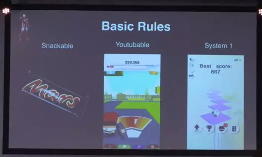 第一条便是“快餐式游戏”,即用户可以快速打开游戏后玩一局便离开;而Youtubable指的是用户能够在两秒内理解游戏玩法;我们还有系统1和系统2,其中系统1的含义和Youtubable相类似,也是指玩家能够快速掌握游戏的玩法。