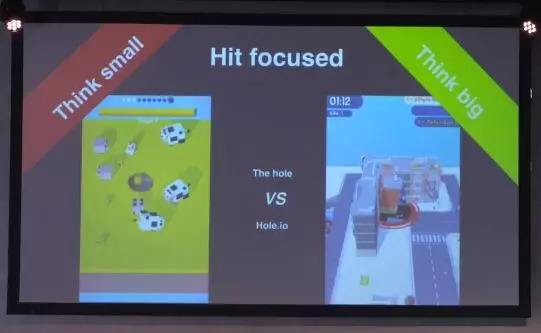 此外,我们在构思游戏的过程中,会遵循以小见大(think small)的思路。我们会先大概描绘出游戏机制,随后投放到市场上进行测试,再根据留存率等种种数据表现进行进一步优化,最后打造出一款爆品。