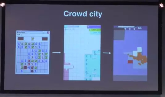 《Crowd City》这款游戏的原型其实来自于《扫雷》。在制作这款游戏时,我们立足于两个有趣的点:其一,在游戏中玩家无法看到地图的全貌而要对周边环境进行探索;其二,我们发现带领着一群人在城市内到处“扫荡”是一个很有意思的玩法。
