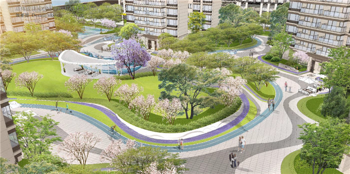 整个园区以山影、水韵等主题语言打造园林景观,园区内规划了约1000㎡中央草坪,设计巧妙的主题水景,园区内还种植有蓝花楹、樱花等植物,可以想象茶余饭后,穿过樱花大道,拾趣蓝花楹是多么美好的景象,规划有星光跑道,羽毛球场、能量加油站等设施,可谓是麻雀虽小五脏俱全。每一幢架空层,计划打造成图书馆、健身房、棋牌室、会客厅、攀岩地等主题空间,满足不同年龄段人群的各种需求。