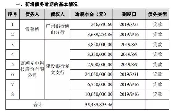 另外,雪莱特及子公司新增5548.59万元逾期债务,其中大部分为子公司富顺光电所欠银行贷款,其逾期金额为5155万元。