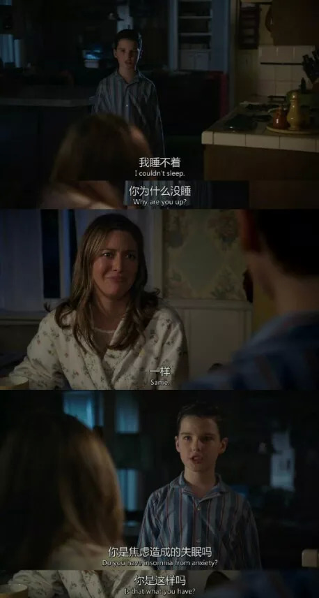 夜晚,睡不着觉的小谢尔顿看见了同样没睡的妈妈。