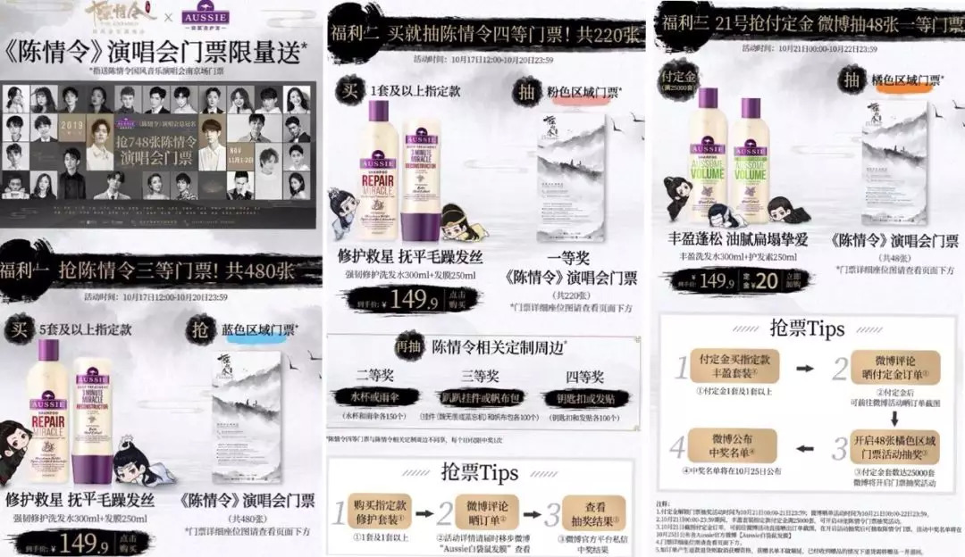 而在各种品牌活动中,《陈情令》的身影再次出现,并在今年双十一粉丝圈中激起热议。在各品牌旗舰店以及淘宝主播的豪掷下,令无数粉丝朝思暮想也难以得到的《陈情令》演唱会门票被大送特送:限量15张演唱会门票立即预定限定款大白瓶即可抽奖赢取;购买5套及以上Aussie洗发水指定款抢《陈情令》三等门票共480张、21号抢付定金微博抽48张一等门票、买就抽《陈情令》四等门票共220张……