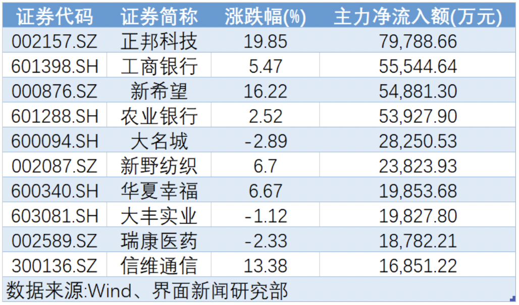 Wind提供的数据显示,本周获主力资金持续净流入且五日累计净流入额超过1亿元的个股共有13只,较上周增加8只。其中正邦科技(002157.SZ)、工商银行(601398.SH)、新希望(000876.SZ)本周累计净流入额居前,分别为7.98亿元、5.55亿元、5.49亿元。