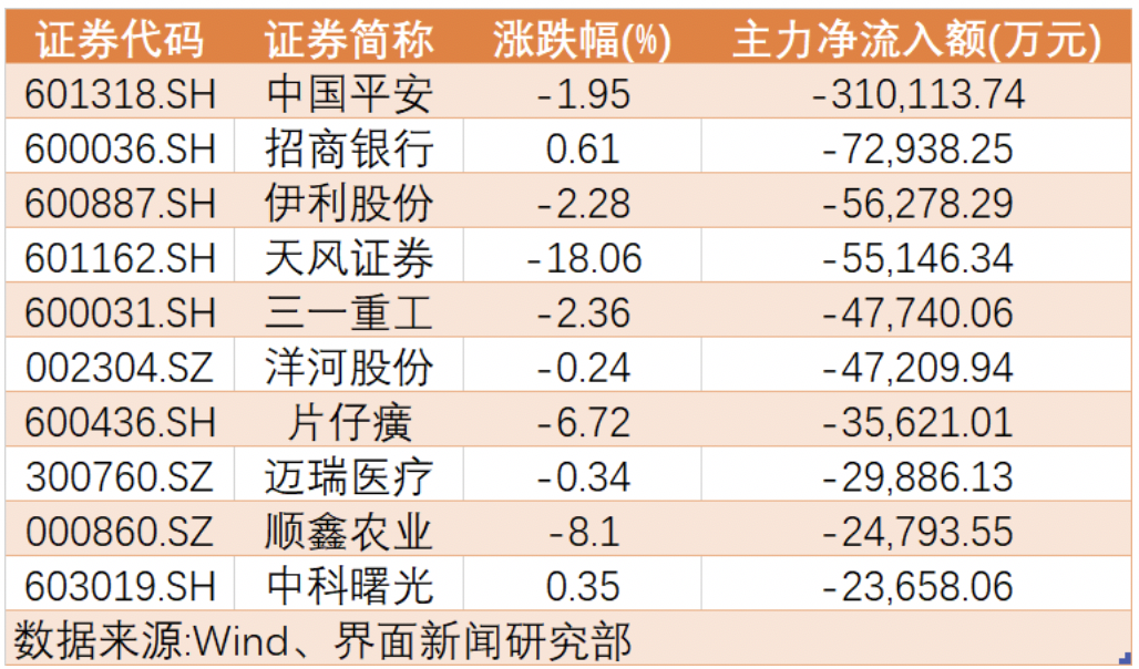 在本周主力资金持续净流出个股中,共计52只个股累计主力资金净流出额超过1亿元,较上周增加58只。这其中,中国平安(601318.SH)、招商银行(600036.SH)、伊利股份(600887.SH)等个股本周遭主力抛售幅度最大,其累计净流出额分别为31.01亿元、7.29亿元、5.63亿元。
