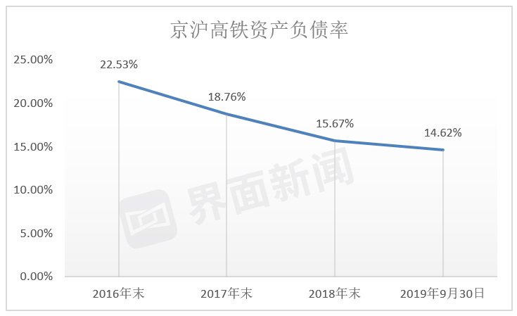 而最近三年,京沪高铁的资产负债率也一直在下降,2016年22.53%,2017年18.76%,2018年则降至15.67%。