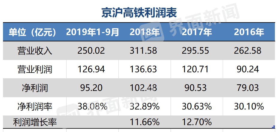 2018年,京沪高铁的营收为311.58亿元,净利润为102.48亿元,净利润率为32.89%。近1/3的利润率,对于整体处于亏损的铁路行业来说非常亮眼。