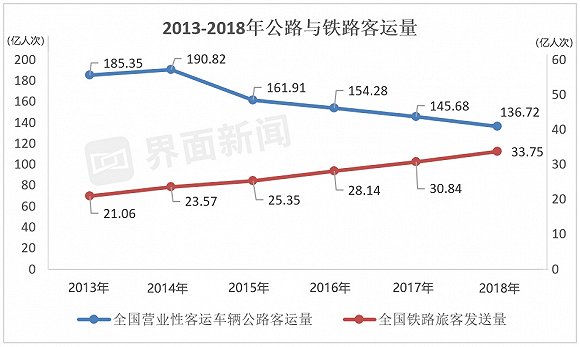 交通部数据显示,2014年是全国营业性客运车辆公路运输量(不包括城市内部的公共汽电车)最后一次增长,达190.82亿人次,此后便以每年5%左右的速度一路下滑。