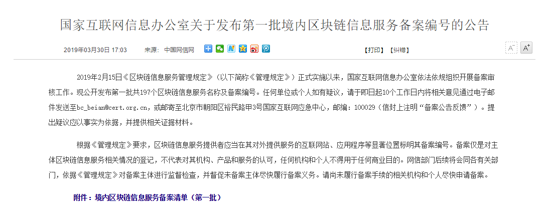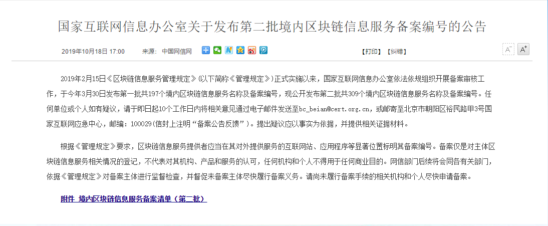 3月30日,国家互联网信息办公室发布了第一批境内区块链信息服务备案编号的公告,其中共包含了197个区块链信息服务备案项目。10月18日,第二批清单公布,一共涵盖了309个境内区块链信息服务备案项目。