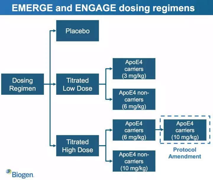 第一,在两个独立的临床试验(代号为 EMERGE 和 ENGAGE)当中,只有其中一个的高剂量组显示出了统计学差异,而另外一个没有。目前原因不清楚。
