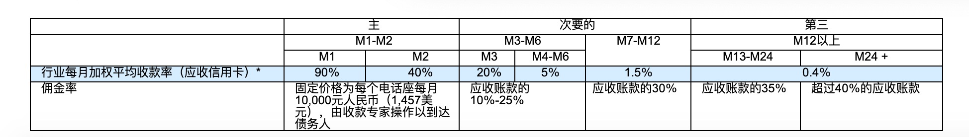 对于信用卡为代表的传统金融行业,首期应收款(primary)是逾期1~3个月的应收款,二期应收款(secondary)在到期日后4~12个月内,三期应收款(tertiary)在到期日后12个月以上或已清账的应收款。对于新兴的在线消费金融行业,首期应收款是在逾期1~3个月之内,次要应收款是在逾期4~6个月之内,三期应收款是在逾期6个月以上或已清账。
