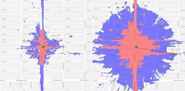 左边是毫米波基站的辐射图,红色区域表示可以达到1Gbps网速,蓝色区域表示可以达到100Mbps网速。
