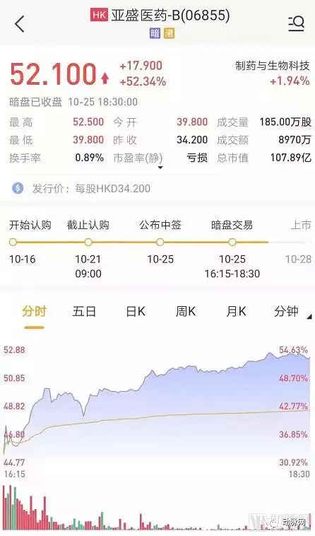 10月25日,亚盛医药在暗盘39.8元每股高于发行价开盘后持续上涨,最终以52.1元每股收盘,收盘涨幅52.34%。这让人更加期待亚盛医药今日在港交所的表现。