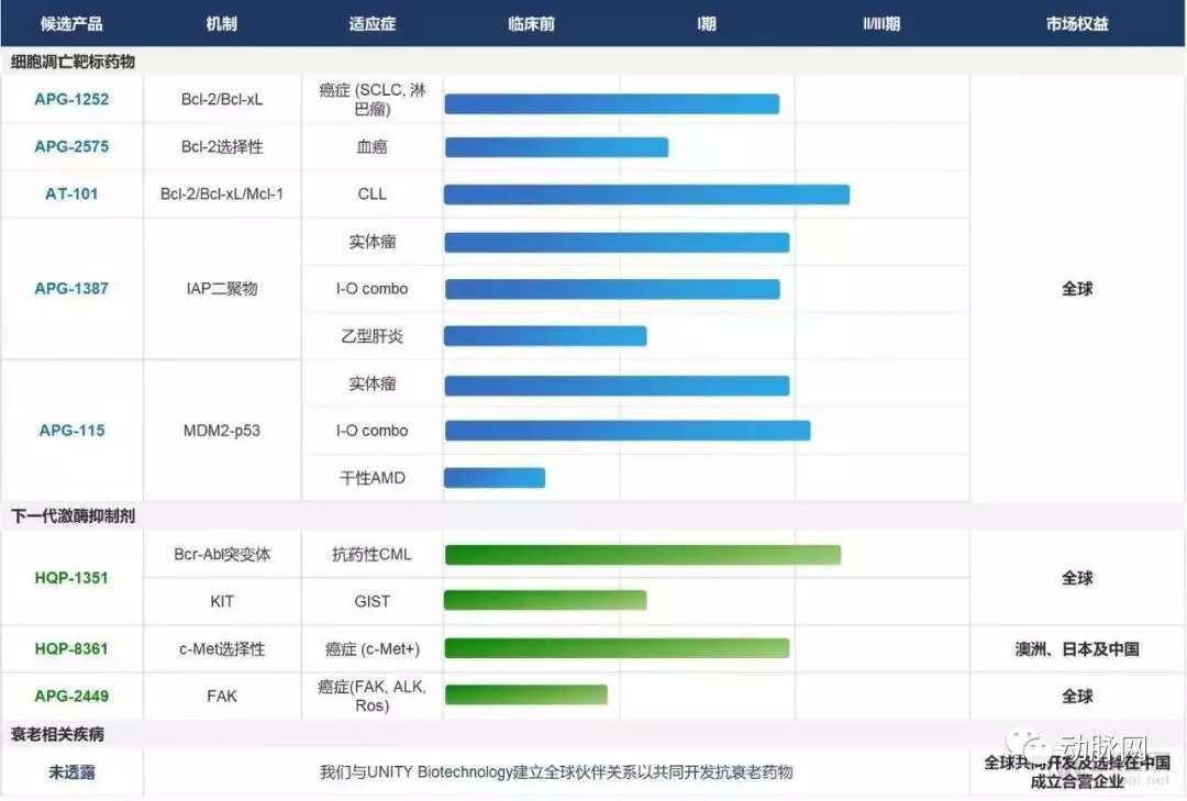 另外还有两项细胞凋亡靶向化合物正处于临床I期或II期临床试验阶段,即APG-1387(泛IAP抑制剂)和APG-115(MDM2-p53抑制剂)。