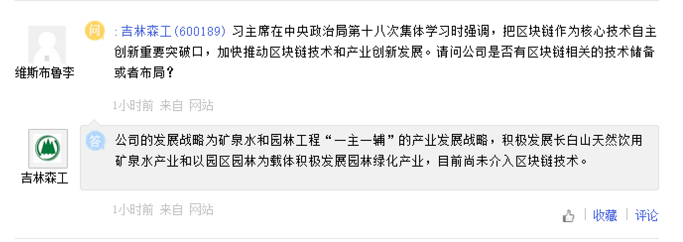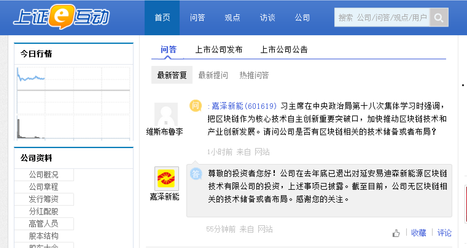 据上证e互动内容显示,一位叫“维斯布鲁李”的股民,在清早时分就对嘉泽新能发问,欲了解公司是否有区块链相关的技术储备或者布局。而嘉泽新能很快就给出了回复,公司称:“公司在去年底已退出对延安易迪森新能源区块链技术有限公司的投资,上述事项已披露。截至目前,公司无区块链相关的技术储备或者布局。”