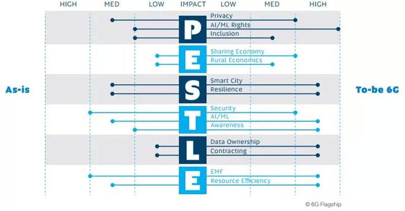 ▲政治、经济、社会、技术、法律和环境对6G的影响