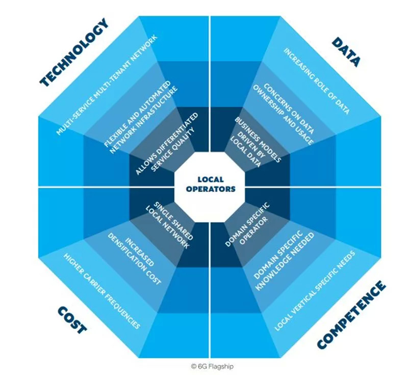 在可预见的将来,由于长期频谱许可,目前用于移动通信网络的较低频段(低于4 GHz)预计将保持稳定并由运营商主导。然而,6G时代,针对室内环境和室外城市空间的超高效短距离网络的新频段将变得很普遍。这些本地网络将针对具有特殊需求的垂直市场,并将由不同的利益相关者进行部署,从而向新的参与者、新的投资者和新的生态系统开放。建立多个重叠的超密集网络将很快变得不可行,并将导致不同的利益相关者在一个设施内部署单个网络以服务于多个用户组和服务。