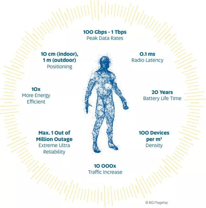 预计未来的无线网络将支持各种各样的有时相互冲突的要求。预计6G将成为第一个要求超高速链路的无线标准,其每个链路的峰值吞吐量超过每秒兆比特(Tbps)。6G用例(例如无线工厂自动化)将需要非常复杂的操作,例如具有超高可靠性和超低延迟的通信,高分辨率本地化(在厘米级别)和高精度设备间同步(在1 μs内)。预计6G可靠性和等待时间要求会因具体情况而异。最极端的一种是工业控制,其中十亿个传输位中只有一个错误位具有0.1 ms的延迟。
