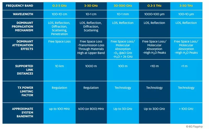下图给出了可用于5G和6G的频带的基本特性。应注意的是,从30 GHz开始进入THz区域时,自由空间损耗的增加非常小。如果天线面积保持恒定,则通过增加天线增益来补偿自由空间损耗。而不是自由空间的损失,较高频率的缺点是RF硬件的复杂性和并行性增加,并且波束宽度减小,这在移动应用中产生了信号采集和波束跟踪的问题。