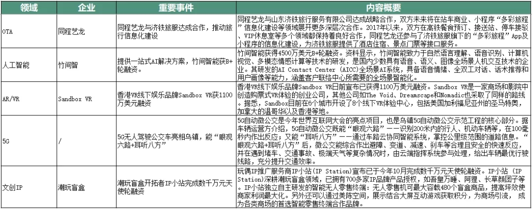 从获得融资的企业来看,AI和VR是本周重点。提供一站式AI解决方案的竹间智能获得B+轮融资,其全场景AI系统AICC未来应用在旅游客服行业,能够大大降低旅游企业的客服中心的人工成本,但旅游客服面临的问题众多,目前的AI系统能够解决部分模式化问题,但个性化问题仍需人工协助。