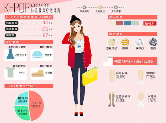 另一部分则是基于大数据,发布一份90后小众文化潮流趋势图谱,全面统计过去一年淘宝网上活跃的数以亿计90后的购买数据,进行数据建模、分析,借此描绘出20张中国90后的非典型时尚面孔。例如,通过数据统计发现,淘宝上最受90后喜爱的韩国明星是孔孝真,其服装同款搜索热度达每月200万次,远超允儿、郑秀晶;90后最爱的潮牌则是New Era。