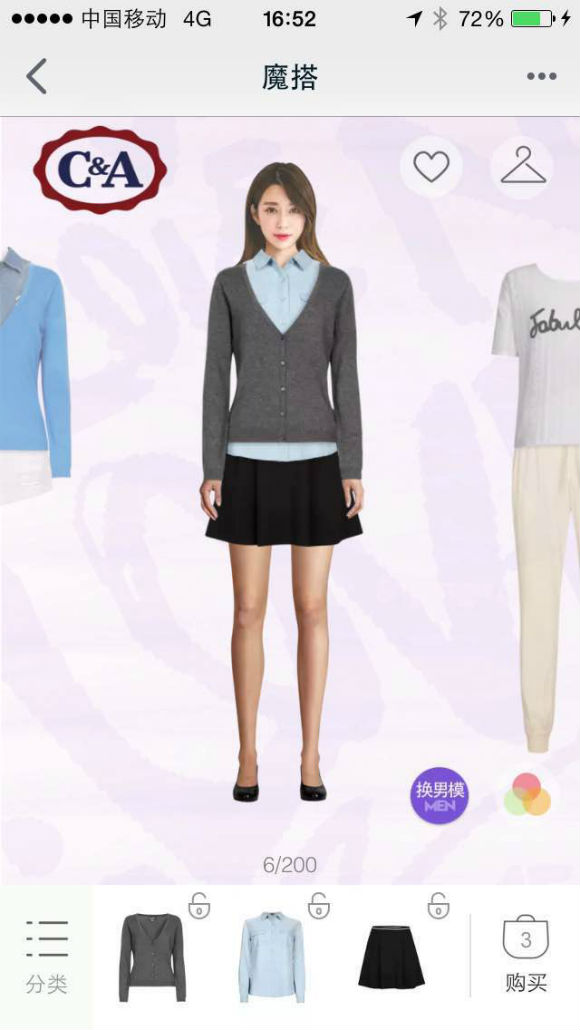 当然,如果不愿意出门,淘宝和天猫无线端也推出了名为“魔搭”的虚拟搭配试衣间,可以在手机上看到服装上身效果。目前,已经有TOPSHOP、GAP、Levi’s、速写等130多个品牌为“魔搭”商品池提供近万款商品供用户搭配。