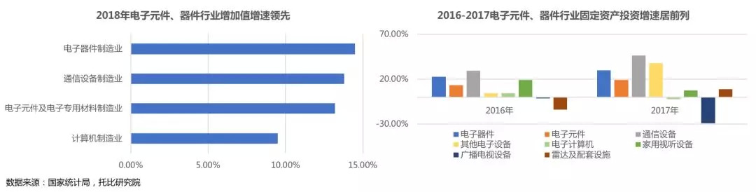 另外,在2018年电子信息制造业主要四个细分领域(通信设备制造业、电子元件及电子专用材料制造业、电子器件制造业、计算机制造业)增加值同比增速中,电子器件以14.5%的增速稳居前列,电子元件及电子专用材料制造业以13.2%的增速,与通信设备制造业13.8%相差不大,并远高于计算机制造业的9.5%。从投资增势来看,2016年—2017年电子器件、电子元件行业的固定资产投资增速均在前列。