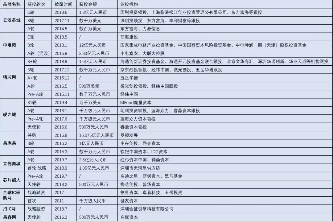 其中B轮之前的获投平台有:立创商城、芯片超人、全球IC采购网、扫IC网、易容网,其中B轮之后(含B轮)获投平台有:云汉芯城、中电港、猎芯网、硬之城、易库易(被收购),具体融资情况如下: