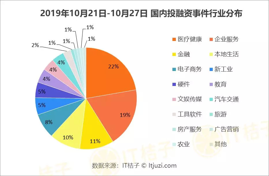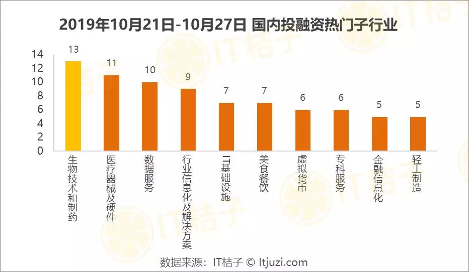 上周最受投资人追捧的子行业分别是生物技术和制药、医疗器械及硬件、数据服务、行业信息化解决方案、IT基础设施、美食餐饮、虚拟货币、专科服务、金融信息化、轻工制造。